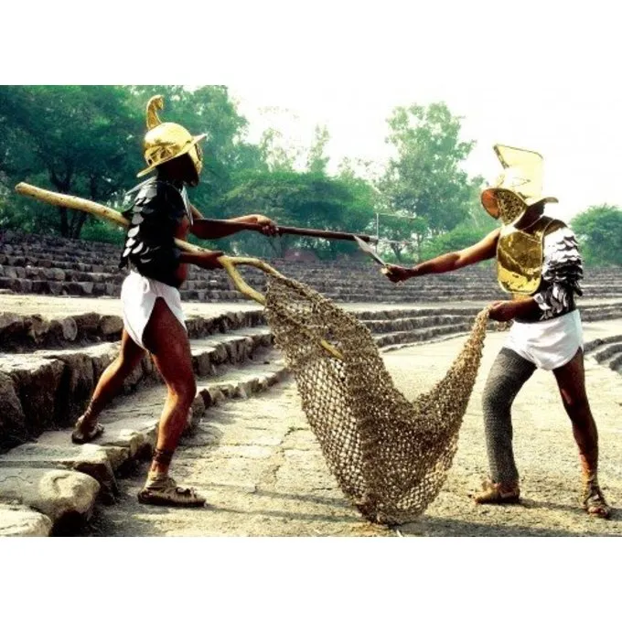 Le filet a été utilisé pour piéger l’adversaire, après cette rétiaire poignardé avec son trident. Ce filet est tissé à la main de 4 mm corde de jute épaisse. Il a moûts de 4,5 x 4,5 cm et est de 1,3 mètres carrés. Il pèse 1,4 kg.