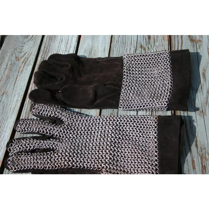 Ces gants en cotte de mailles sont faites de suède et sont recouverts de 1,6 mm d’épaisseur anneaux aboutés zingué avec un diamètre intérieur de 6 mm. Les anneaux sont tissés quatre en un. Les gants sont fabriqués en taille de gant neuf.