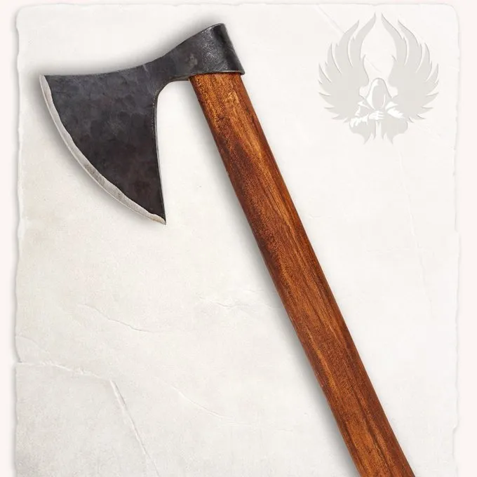 Cette hache de Mytholon pratique est parfait pour la reconstitution historique ou camp LARP! Cette hache est confortable à tenir dans la main et vous pouvez l’utiliser pour couper du bois et toutes sortes d’autres tâches quotidiennes. La hache est forte et en bois et en acier. Les axes comme celui-ci ont été utilisés dans le (début du) Moyen Age. La tête de hache a un fini antique et roué de coups à la main afin qu’il semble authentique supplémentaire.