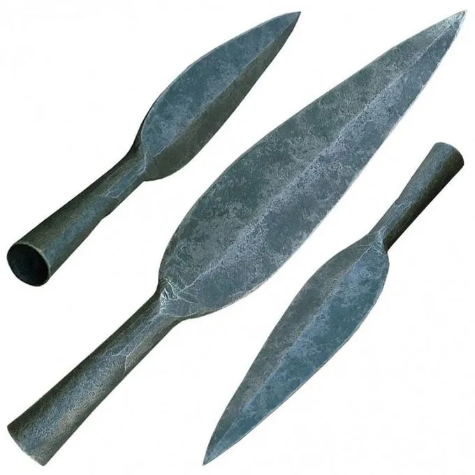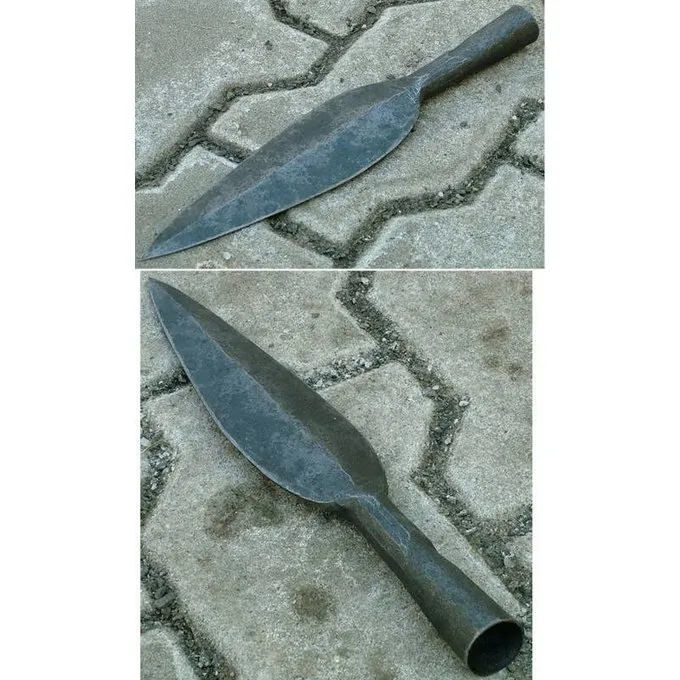Des pointes de lance comme celle-ci ont été utilisées entre le 7ème et le 1er siècle avant JC. L’original de cette réplique a été retrouvé en Gaule et fait désormais partie de la collection du Musée d’archéologie nationale de Saint-Germain-en-Laye (sous Parijs). Ce type était fréquemment utilisé par les tribus germaniques et celtiques dans toute l’Europe.