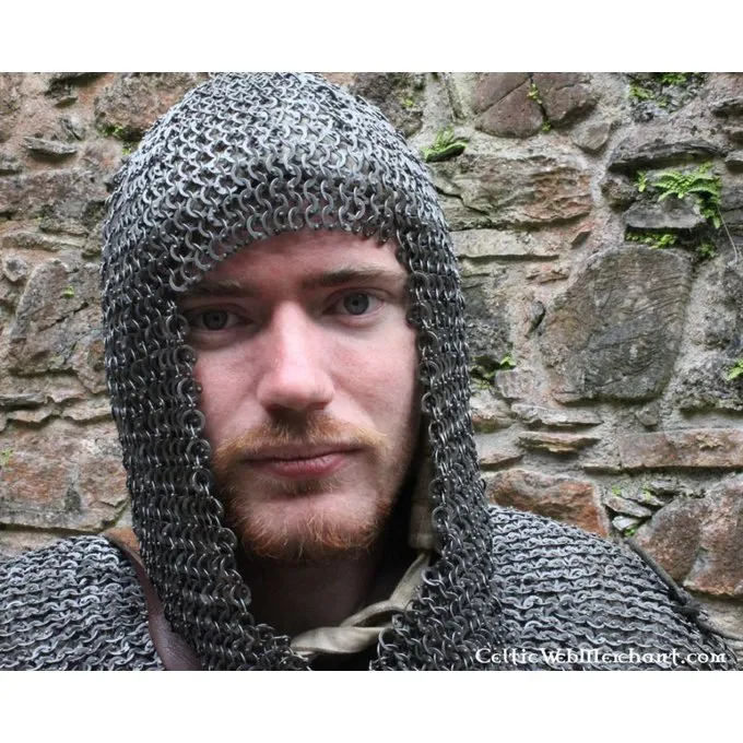Cette coiffe est faite de 1,8 mm de large anneaux plats avec un diamètre interne de 8 mm. Ils sont tissés quatre en un, puis rivés avec des rivets ronds. Il pèse environ. 2,8 kg.