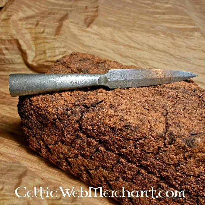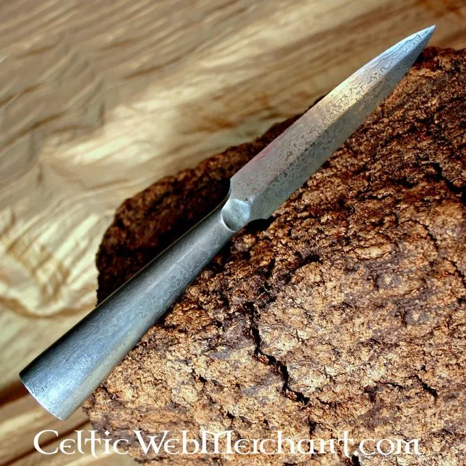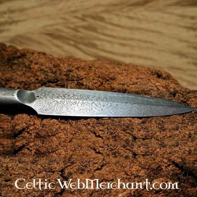 Détails de produit: Longeur: 24.5 cm / Dimensions de fer: 12 cm / Dimension d’oeil: 2.2 cm / Poids: 210 g / Matériel: 512 couches d’acier de Damas / Tranchant: semi-tranchant / Hampe incluse: non / Basé sur un original historique: oui /