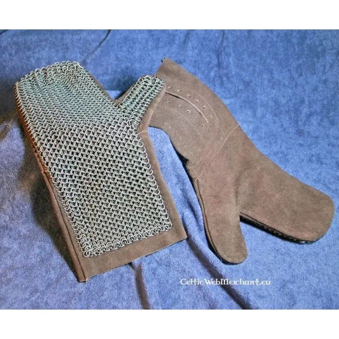 Ces gants en cotte de mailles sont faites de cuir de daim noir avec anneaux tissés chaîne de courrier sur le dessus. La cotte de mailles sur le dos de la main a un rembourrage de laine en dessous pour une protection supplémentaire. Les anneaux sont en butée 1,6 mm d’épaisseur et ont un diamètre intérieur de 6 mm.