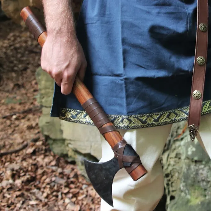 Cette hache Viking est basé sur les premiers originaux médiévaux et axes utilisés en série comme les Vikings et le dernier royaume. Il a un fini forgé à la main et une tige en bois avec plusieurs runes. L’arbre et la tête de hache sont décorées avec des sangles en cuir. Un accessoire idéal pour reconstitution Viking ou pour les costumes Viking.